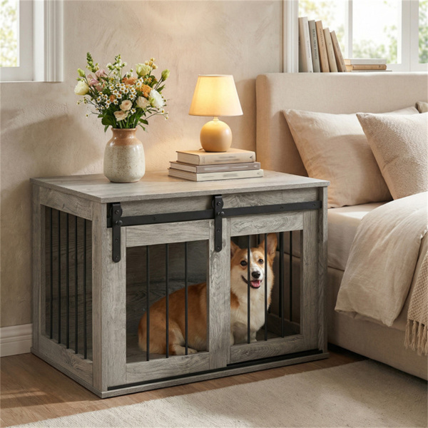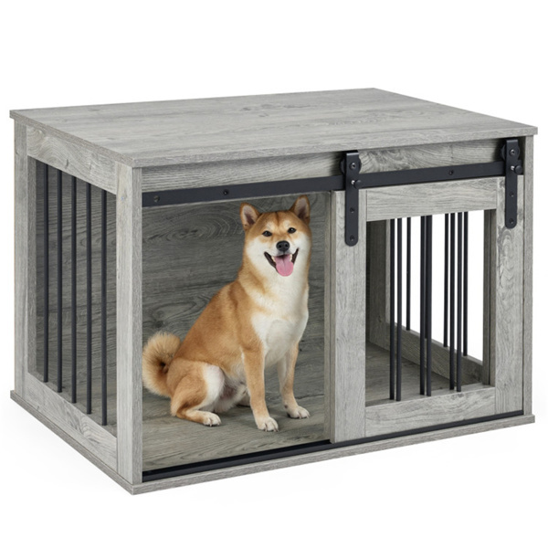 Home > 31.5" Dog Crate Furniture with Sliding Barn Door, Wooden Dog Kennel End Table for Indoor Use - Gray